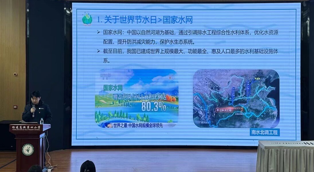 随后,支部在报告厅为四年级员工带来一场生动有趣的“世界水日”主题宣讲。主讲人钱宝灏、赵若彤结合专业知识,以图文并茂的方式,向同学们介绍了世界水日的由来、历年主题、国家水网建设成就,以及农业节水灌溉的多种方式,如喷灌、滴灌、微灌、地下灌溉和新型陶瓷灌水器技术。宣讲还特别结合杨凌与西安的用水历史脉络,深入浅出讲解了引汉济渭工程如何实现长江与黄河在关中大地“握手”,让同学们感受到国家水网建设的宏伟与深远影响。