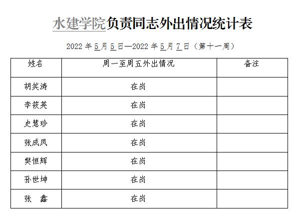 英国365集团官网负责同志外出情况统计表(第十一周)