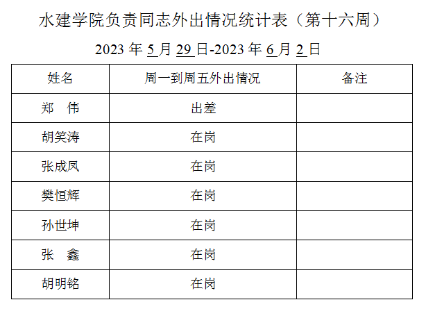 英国365集团官网负责同志外出情况统计表(第十六周)