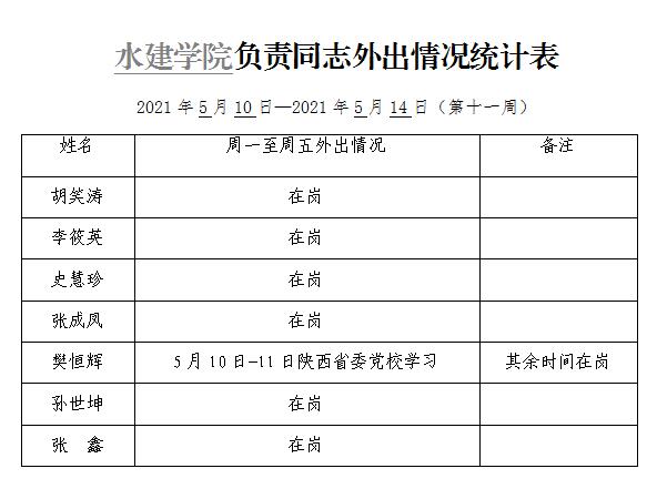 英国365集团官网负责同志外出情况统计表(第十一周)
