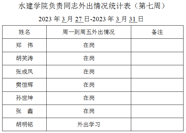 英国365集团官网负责同志外出情况统计表(第七周)