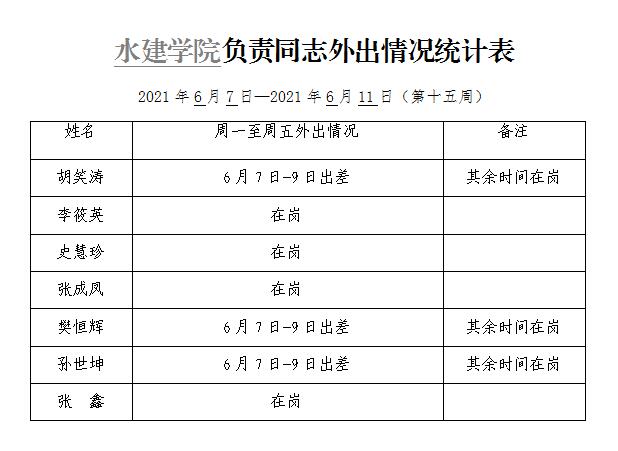英国365集团官网负责同志外出情况统计表(第十五周)