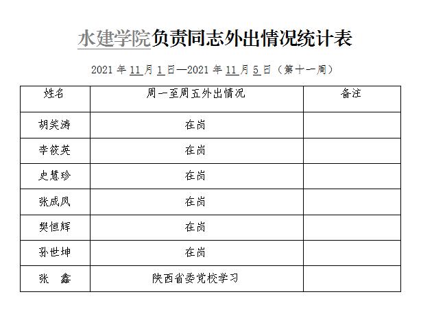 英国365集团官网负责同志外出情况统计表(第十一周)