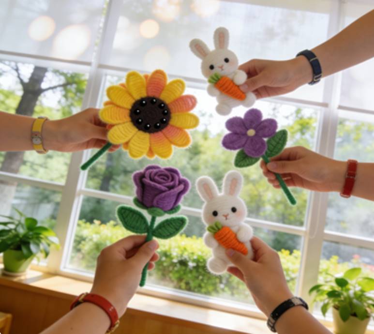 随后的作品展示与分享环节将活动推向高潮。同学们纷纷上台展示自己精心制作的扭扭棒花朵、小动物、装饰品等,并分享创作灵感与作品用途——有的计划用作书桌点缀,有的准备赠予实验室同门,有的则希望作为纪念品珍藏。志愿者为每位参与者拍摄了手持作品的纪念照片,记录下这份亲手创造的成就感与喜悦。