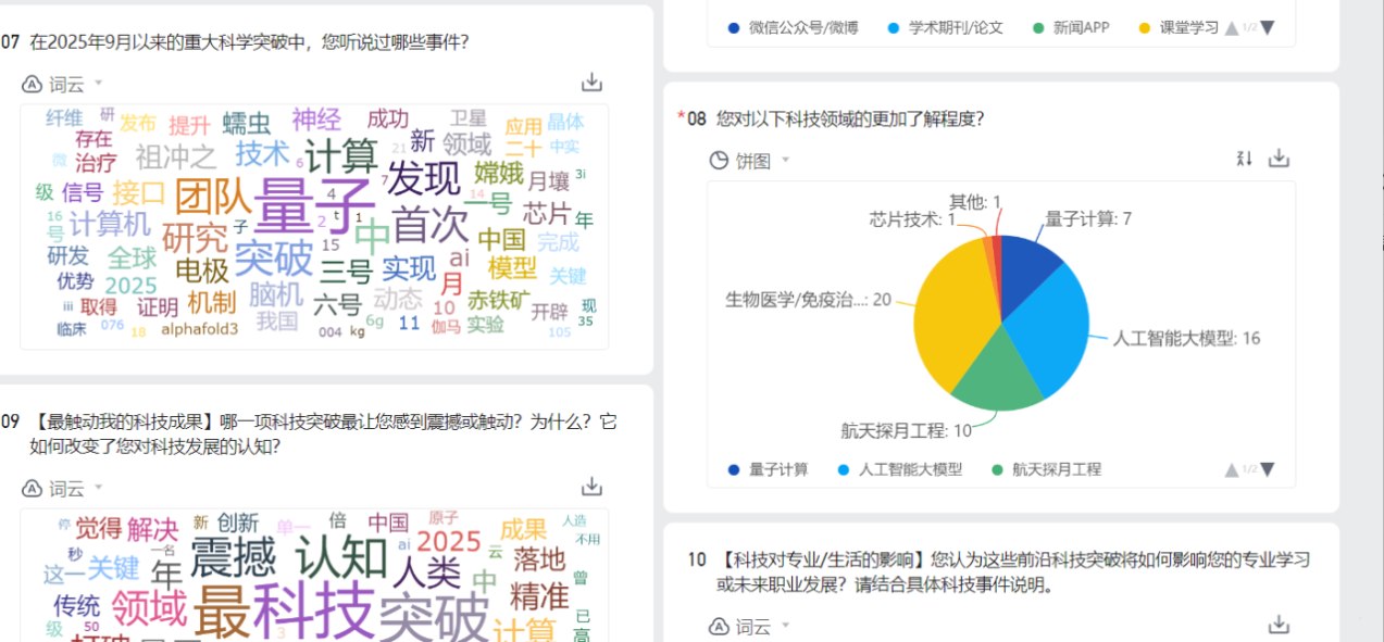活动以2025年9月以来以来任一科学界重大事件或研究成果为内容,引导同学们主动深入科学前沿。参与者们通过查阅文献、深入学习,围绕各自感兴趣的科学事件,撰写了内容丰富、思考深入的文章。调查显示,员工在获取科技资讯方面呈现出“主流引领、多元补充”的特征。绝大多数同学通过“微信公众号/微博”等新媒体平台及“学术期刊/论文”专业渠道关注科技动态,同时辅以“新闻APP”“课堂学习”与“同学/老师交流”等方式,反映出信息获取路径的多样性与互补性。在科技突破内容方面,同学们的关注点高度集中于2025年9月以来量子计算、生物医学、人工智能与航天工程等前沿领域。展现出同学们对国家重大科技项目与颠覆性技术的高度敏感。“生物医学/免疫治疗”“量子计算”“人工智能大模型”及“航天探月工程”是大家普遍关注的方向。这些方向不仅与全球科研热点高度吻合,也体现出同学们在认知前沿的同时,能够结合自身专业背景进行跨领域思考与创意延伸。