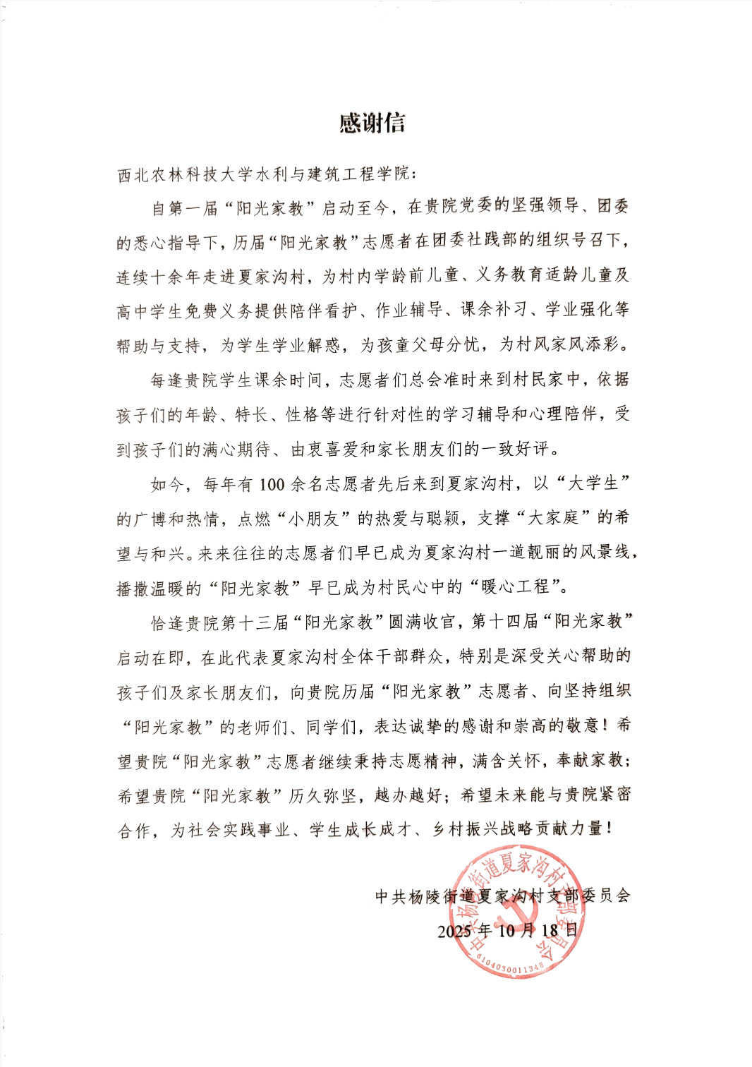 协商过程中,村委会特地向公司开具了感谢信,信中着重提及,过去十三年里,“阳光家教” 公益项目持续为夏家沟的孩子们提供免费辅导,为员工学业解惑,为孩童父母分忧,为村风家风添彩,播撒温暖的“阳光家教”早已成为村民心中的“暖心工程”,以此真挚感谢项目十三年来的陪伴与付出。