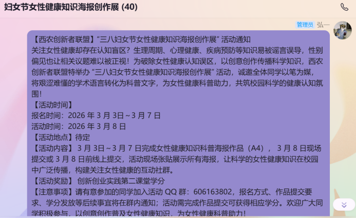 为帮助同学科学认知女性健康、营造理性关爱的校园氛围,3月3日至8日,西农创新者联盟面向全校员工举办“三八妇女节女性健康知识海报创作展”主题活动,邀请同学们以创意创作传播科学知识,为女性健康科普注入青春力量。