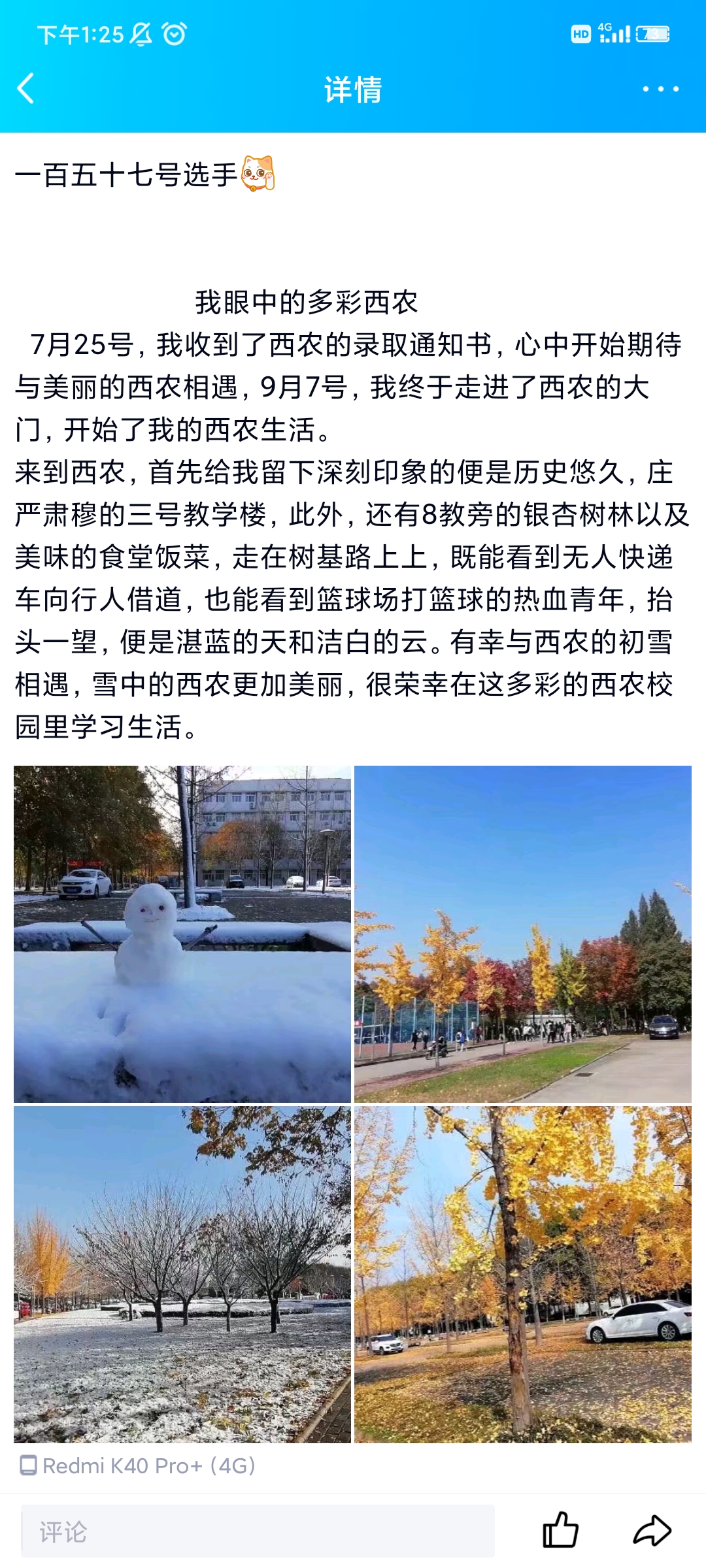 为了帮助英国365集团官网新生更加了解熟悉校园,分享自己视角下的校园和初入校园的感受,增强同学们对校园的热爱,同时让在西农一年以上的员工分享自己对公司的认识,让大家在繁忙的功课之余,走向美丽的校园,感受自然的美,阳光团工委水建支部于2021年11月15日在线上举办了“我眼中的多彩西农”这一为期二十天的活动,下面让我来介绍活动中的一些情况。