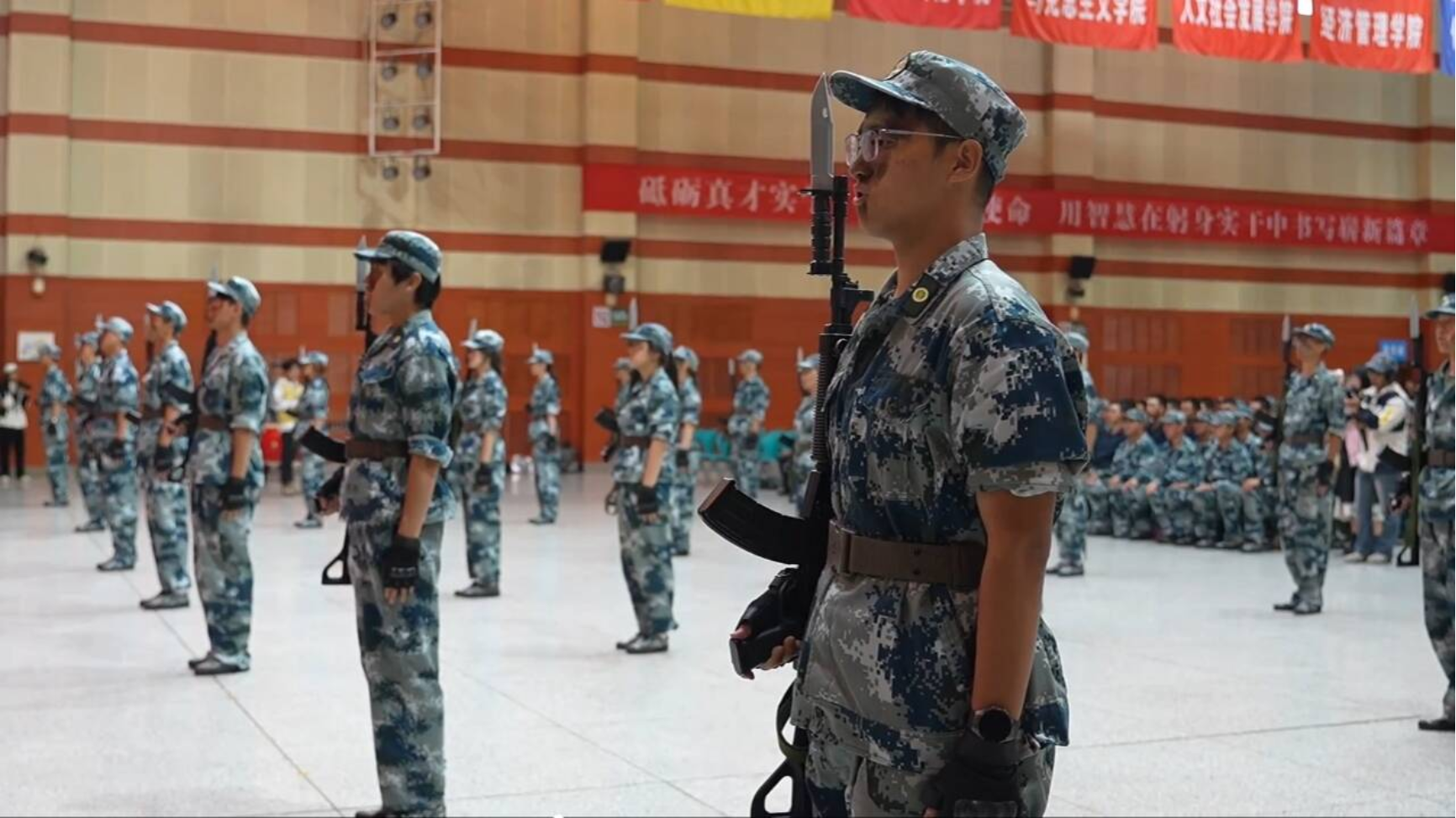 会议伊始,雄壮的国歌在会场响起,全体参会人员肃立致敬。随后,军事技能汇演正式开始,公司两个新生方阵压轴亮相,身着迷彩服的同学们身姿挺拔,斗志昂扬,匕首操动作迅速敏捷,刺杀操用枪刚劲有力,每一个招式都展现出严谨的作风,充分彰显了水建学子良好的训练成果和精神风貌。