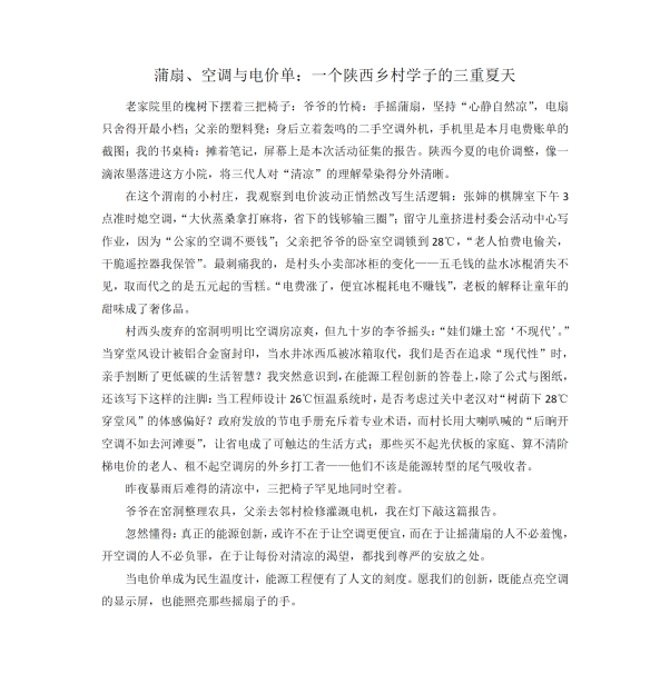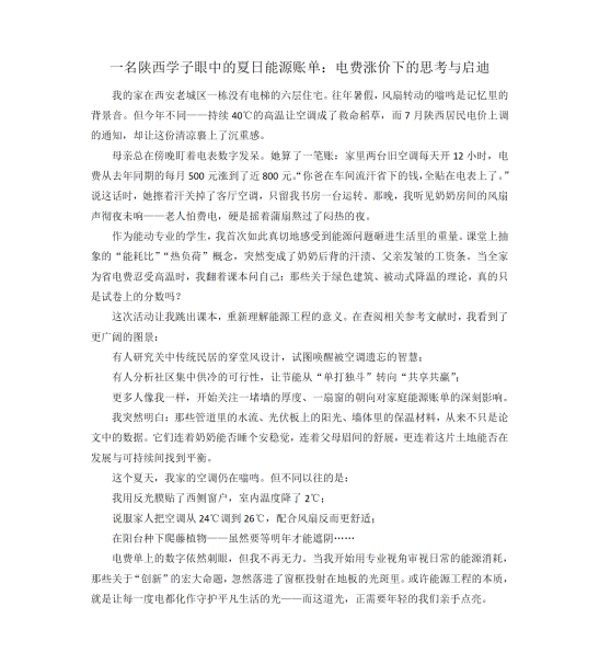 近期陕西省电价调整引发社会对能源使用效率的广泛关注。时值盛夏酷暑,居民降温用电需求激增。联盟以此为契机,设立本次活动主题,倡导员工深入观察思考:如何运用能源工程知识和技术手段,在保障生活舒适度的同时,实现更高效、更可持续的降温节能?活动要求员工围绕“日常生活中能源工程助力消暑解热”的核心方向,撰写具有科学性、创新性和可行性的分析报告或解决方案。