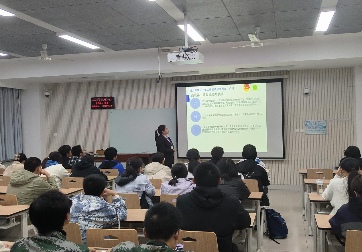 在“第二课堂及‘第二课堂成绩单制度’介绍”部分,宣讲人张喆阐述了第二课堂的定义,即公司课程培养计划之外的开放式教育活动,包括多种形式,是第一课堂的延伸和拓展。同时明确了西农第二课堂成绩单的要求,如各板块学分要求及毕业条件;还介绍了其作用,包括毕业学分认证、素质测评依据和综合评价需要等。