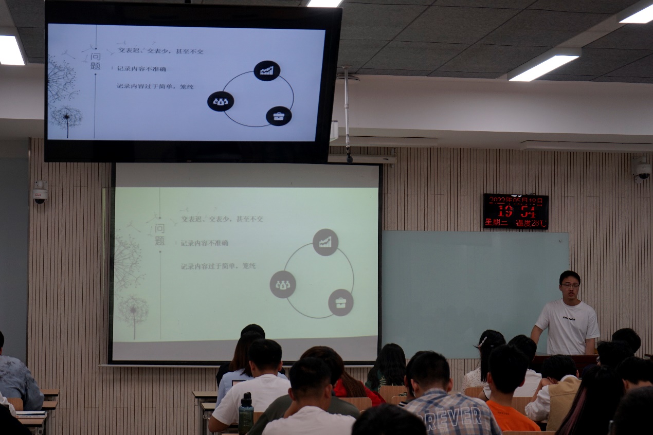 会议开始负责人杨雨晨提出了各班在考勤自查表填写与提交方面存在的问题以及讲解新版考勤自查表,并要求各班学委认真对待。然后提出了各班在同学请加销假方面存在的问题,再次讲解请假销假制度以加强同学们对这方面的重视程度。