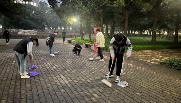 5月15日下午,校园南门广场瞬间成为活力四射的 “清洁战场”。志愿者们穿梭如织,手持扫帚全力清扫落叶与垃圾,目光如炬,任何角落的杂物都无处遁形,广场迅速重现整洁开阔之姿,以崭新面貌担当起校园迎宾的“形象大使”。三号教学楼周边,同学们忙碌而专注,悉心擦拭门窗桌椅,在他们的精心呵护下,玻璃晶莹剔透,桌面光可鉴人,重现井然有序、庄重严肃的氛围。与此同时,图书馆旁的花园中,志愿者化身园艺巧匠,仔细修剪枝叶、悉心浇灌土壤、轻柔扶正树苗,一番打理后,繁花似锦簇拥、绿植葱茏盎然,为这座知识殿堂勾勒出清新诗意的轮廓,铺就宁静舒心的阅读“绿毯”。
