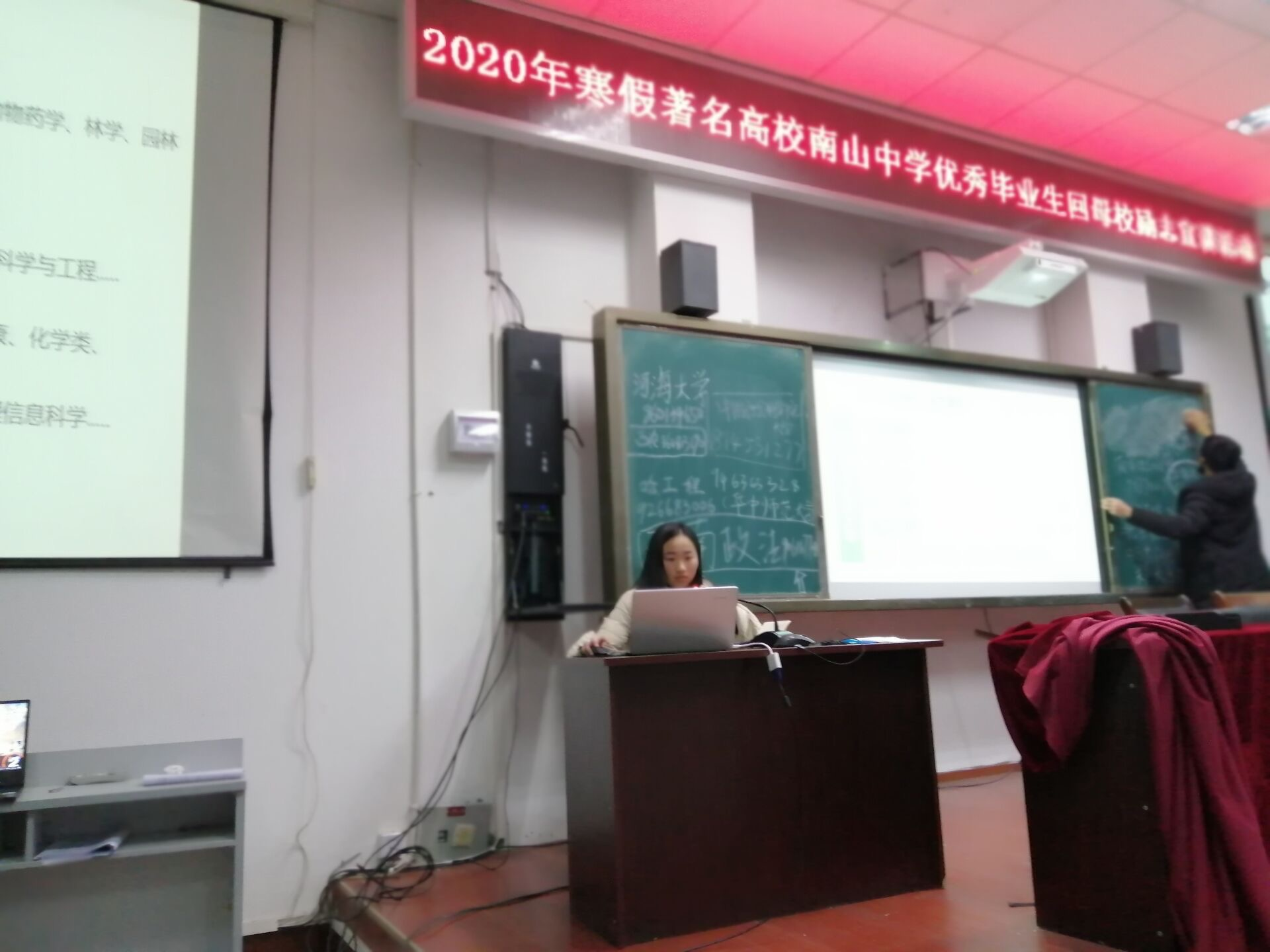 宣传演讲,激情澎湃。18日晚七点,各高校宣讲队伍的演讲环节在南山中学大礼堂进行。由来自草业公司的林思雨同学上台演讲,她首先通过ppt为在坐的高三学子介绍了公司的基本背景和专业概况,随后分享了自己的老员工活,最后是提问环节,作为一名高考“过来人”,她为学弟学妹们分享了自己的学习、复习经验。最后,她为学弟学妹们表达了祝愿:“高三加油,高考必胜!”