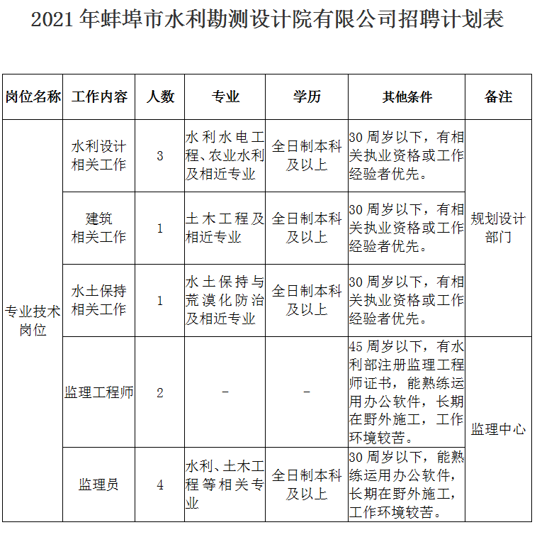 (五)岗位所需的其他报考条件(详见2021年蚌埠市水利勘测设计院有限公司招聘计划表)。