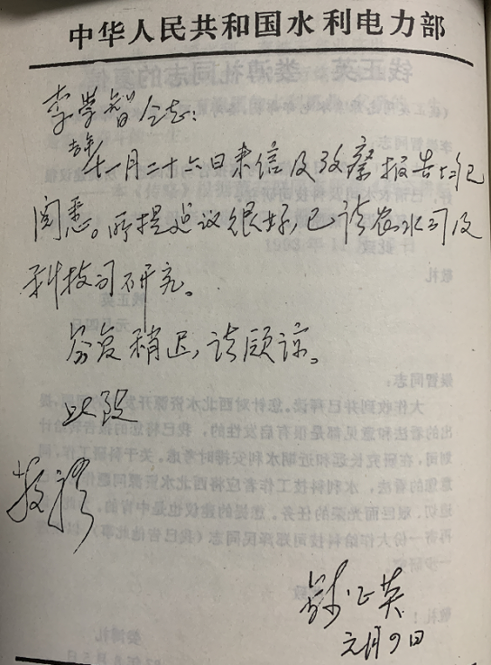 1954年李崇智先生主持开展水工试验 1987年时任水利电力部部长钱正英给李崇智先生的复信