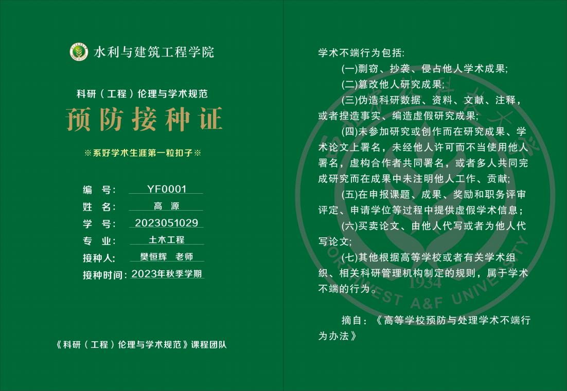 学术预防接种证16K大小,整个色调以绿色为底色,字体以白黄两种颜色,有正反两面。其中,正面上面有公司校徽和“英国365集团官网”字样,其他信息包括员工的编号、姓名、学号、专业以及接种人(授课老师)、接种时间等,在正中间有“系好学术生涯第一粒扣子”字样;背面是摘自《高等公司预防与处理学术不端行为办法》中学术不端行为包括的内容。整个设计布局匀称、大方庄重、严谨和谐,体现公司“诚朴勇毅”的校训。