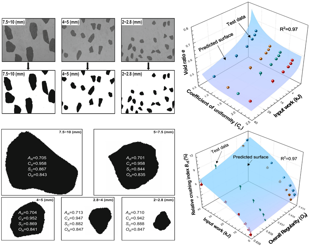 粗粒土二值化处理及颗粒形态参数 粗粒土变形及破碎特性预测曲面