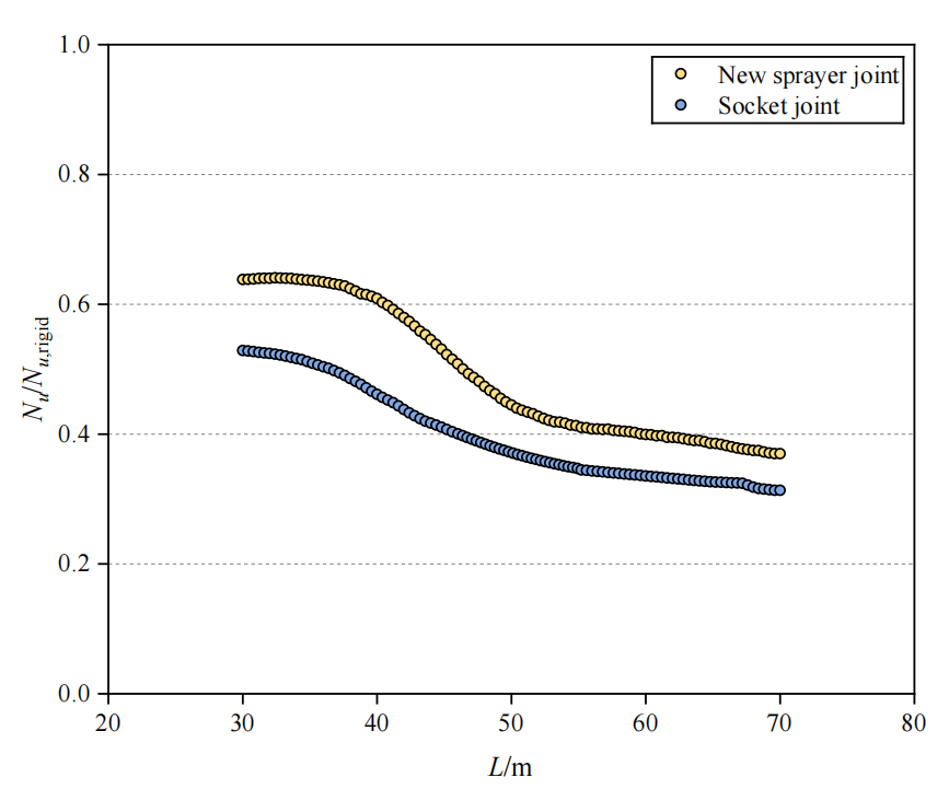 网壳是大跨度空间结构的一种常见结构形式,应用广泛。节点作为网壳的关键部件,其刚度是影响网壳结构稳定性的重要因素之一。基于此,该论文在碗式节点的基础之上,创新性地提出了一种新型喷头式节点,以期提高节点刚度。首先,建立了精细化的有限元模型,研究了轴向拉压荷载作用下周围螺栓半径不同的新型喷头式节点的弯曲性能(见图1);接着,提出了一种改进的双线性模型;最后,研究了新型喷头式节点与传统碗式节点单层柱面网壳结构的稳定性。
