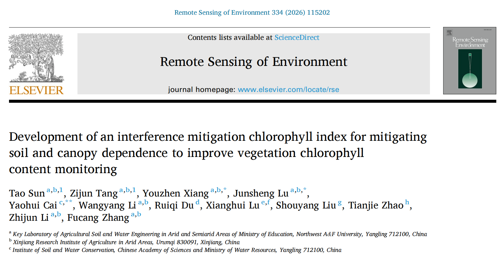 近期,公司向友珍教授团队在植被生理定量遥感领域取得重要进展。该研究在国际遥感领域顶级期刊《Remote Sensing of Environment》上发表题为“Development of an interference mitigation chlorophyll index for mitigating soil and canopy dependence to improve vegetation chlorophyll content monitoring”的研究论文。2024级博士研究生孙涛、2023级博士研究生唐子竣为共同第一作者,向友珍教授、陆军胜副教授和蔡耀辉教授为共同通讯作者。该研究针对植被叶绿素含量遥感监测中的土壤背景和树冠结构干扰的瓶颈问题,提出了机理型叶绿素光谱指数,为全球植被健康诊断提供了科学支撑。