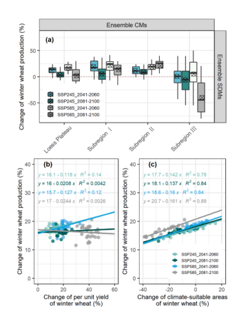 气候变化对全球粮食安全构成巨大挑战。作物单产及其种植面积是评估气候变化对区域粮食安全的两个维度。当前已有相关研究基于作物生长模型(CMs)、物种分布模型(SDMs)和全球气候模型(GCMs)进行模拟,评估气候变化导致的小麦种植区域分布变化和区域总产变化。然而,在考虑未来作物气候适宜区分布变化的情况下,这类方法预测小麦区域总产的不确定性来源尚不明确。因此,如果基于CMs、GCMs和SMDs模拟为气候变化背景下某地区冬小麦生产的田间管理措施和土地政策调整提供参考,首先需要全面评估该区域冬小麦产量和气候适宜种植区域分布对气候变化的响应机制及模型模拟结果的不确定性。为此,该研究采用基于对6个小麦生长模型、9个SDMs和27个GCMs的综合集成方法评估了气候变化对黄土高原冬小麦生产的影响。与1971-2010年相比,在共享社会经济路径(Shared Socioeconomic Pathway,SSP)SSP245和SSP585下,2041-2060年冬小麦区域总产将分别增加14.6%和19.7%,2081-2100年冬小麦区域总产将分分别增加4.9%和3.5%。基于ANOVA方法量化区域总产模型模拟的不确定性,发现相对于物种分布模型和全球气候模型,作物生长模型(CMs)的模拟结果更为确定。
